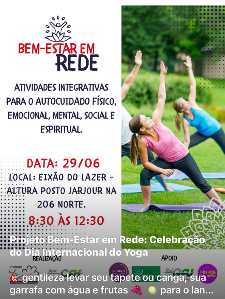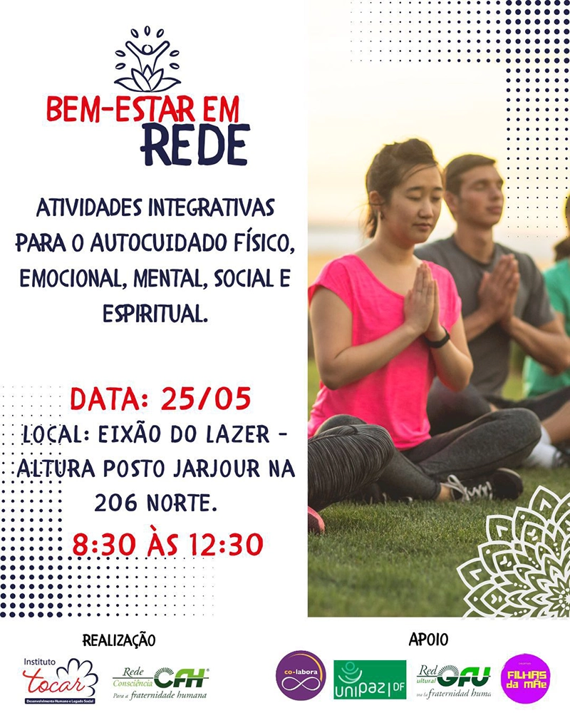 O Bem-Estar em Rede é um projeto de encontro coletivo, aberto e gratuito, que acontece todo último domingo do mês, das 8h30 às 12h30, em meio à natureza, com o objetivo de promover o cuidado integral do ser humano por meio de práticas que equilibram corpo, mente e relações sociais.
